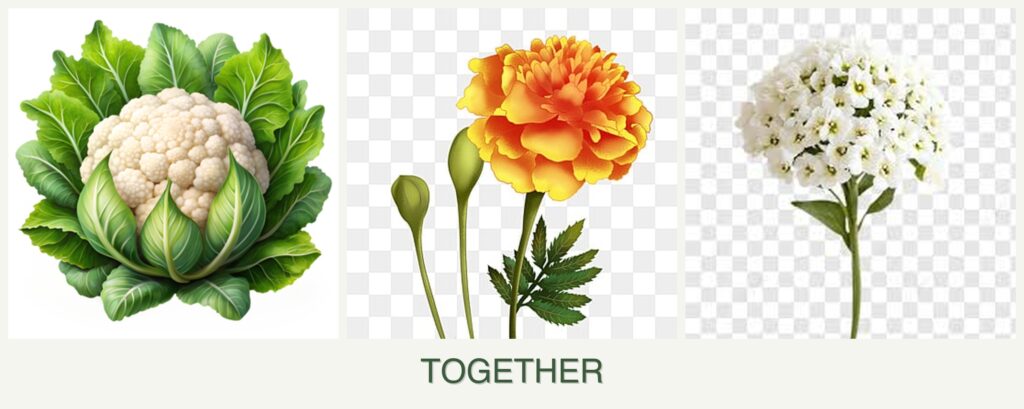 Yes, you can plant cauliflower, marigolds, and alyssum together. These plants complement each other in several ways, making them ideal companions. Cauliflower benefits from the pest-repelling properties of marigolds, which deter nematodes and other harmful insects. Alyssum attracts beneficial insects like pollinators and predatory wasps that can help control pests naturally.