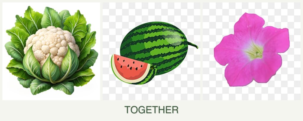 - Spacing: Melons need more space to spread than cauliflower and petunias.