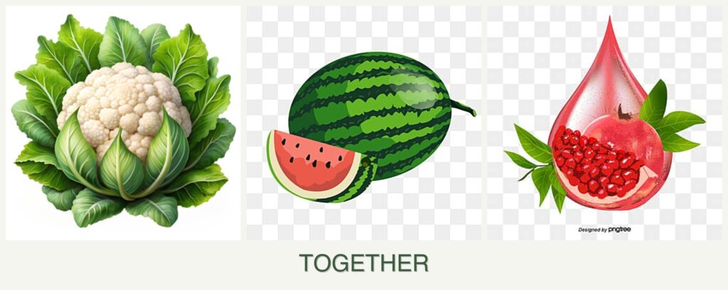 - Growth Requirements: Cauliflower requires cooler climates, whereas melons and pomegranates need warm, sunny conditions.