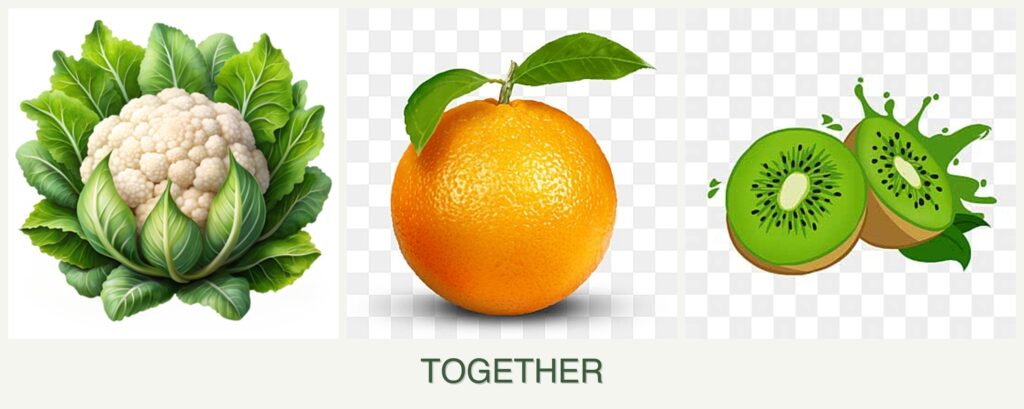- Growth Requirements: Cauliflower thrives in cooler temperatures with consistent moisture, while oranges and kiwi need warm climates and well-drained soil.