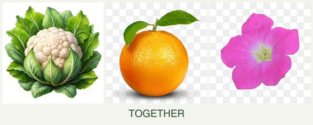 - Growth Requirements: Cauliflower is a cool-season vegetable, while oranges are warm-climate trees, and petunias are annual flowers that thrive in moderate conditions.