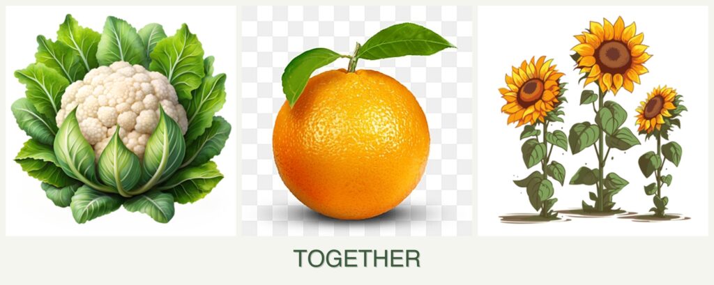 - Growth Requirements: Cauliflower is a cool-season vegetable, while oranges are warm-climate trees, and sunflowers thrive in full sun. Their climatic needs are too diverse to be compatible.