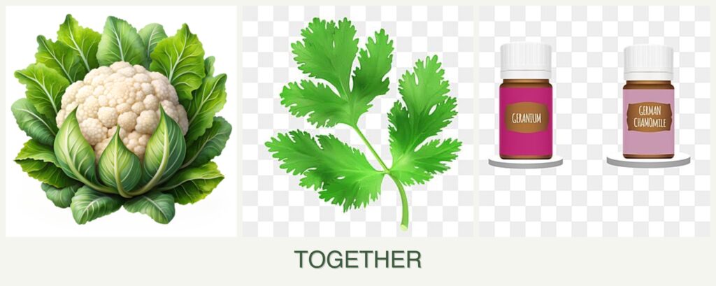 - Resource Competition: Cauliflower’s high nutrient demand can overshadow parsley and geraniums.