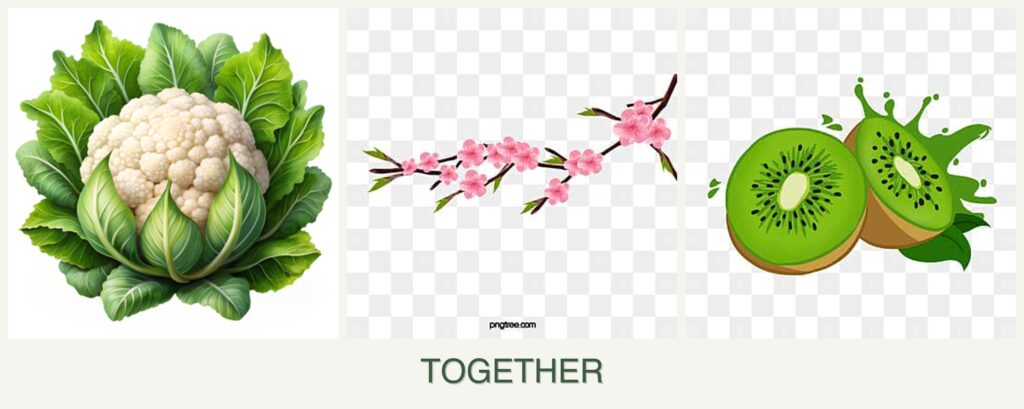 The short answer is NO; planting cauliflower, peaches, and kiwi together is not ideal. These plants have differing growth requirements and can compete for resources.