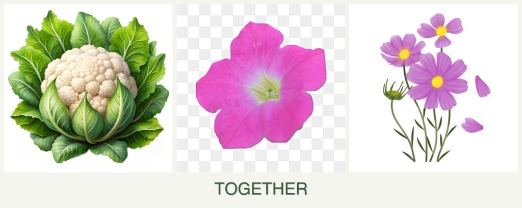 Nutrient Needs and Spacing: Cauliflower requires rich, well-drained soil with ample nutrients, while petunias and cosmos are less demanding. Ensuring adequate spacing and soil preparation can help accommodate these differences.