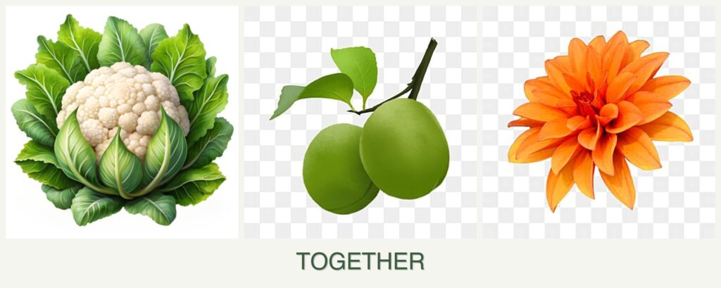 Nutrient Needs and Spacing: Cauliflower is a heavy feeder, requiring nutrient-rich soil, while plums and dahlias have different nutrient needs. Additionally, plums, being trees, require significant space, which can overshadow and compete with smaller plants like cauliflower and dahlias for light and nutrients.