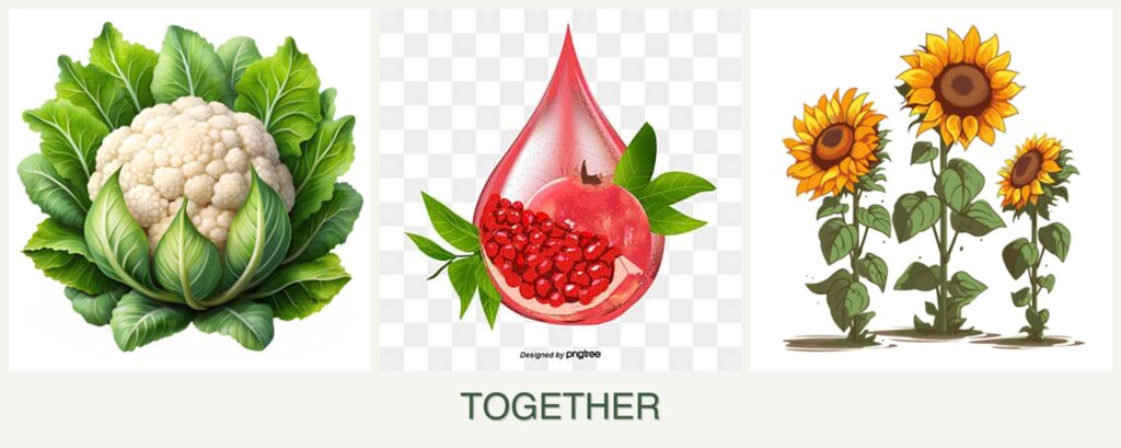 - Optimal Spacing: Plant sunflowers at the back or north side to prevent shading cauliflower. Space pomegranates adequately to allow sunlight penetration.