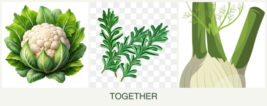 Growth Requirements: Cauliflower thrives in cool weather, while rosemary prefers warm, dry conditions. Fennel can tolerate a range of climates but often competes aggressively for nutrients, which can hinder cauliflower’s growth.