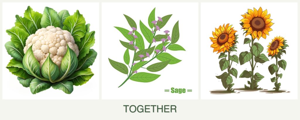 - Nutrient Needs: Cauliflower is a heavy feeder, requiring rich soil, while sage and sunflowers are less demanding, making them suitable companions if nutrient balance is maintained.