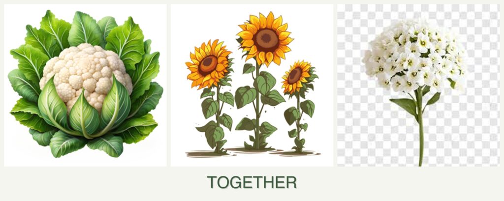 - Growth Requirements: Cauliflower prefers cooler temperatures, while sunflowers thrive in warm, sunny conditions. Alyssum is adaptable and can bridge these differences.