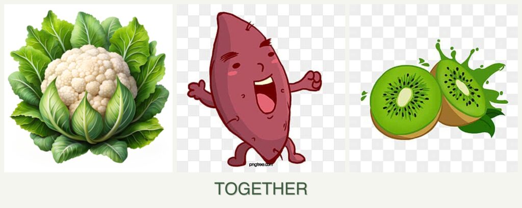 - Growth Requirements: Cauliflower requires cool temperatures and full sun, while sweet potatoes thrive in warm climates. Kiwi, being a vine, needs a trellis and ample space to spread.