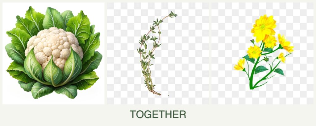 Growth Requirements: Cauliflower requires full sun and consistent moisture, while thyme thrives in similar conditions but can tolerate drier soil. Calendula also prefers full sun and moderate watering.