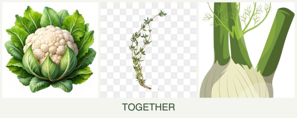 - Timing: Plant cauliflower and thyme in early spring. Fennel can be planted later to avoid competition.