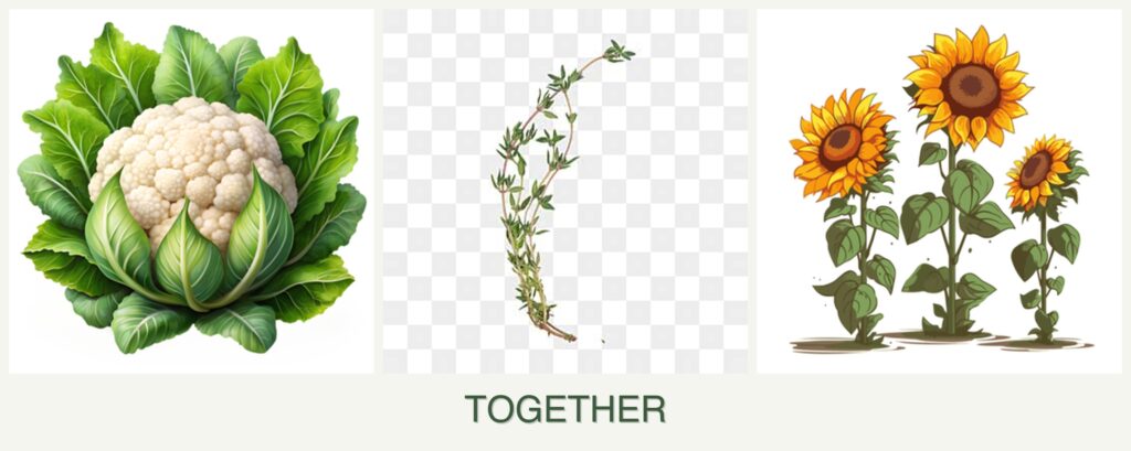 Pest Control: Thyme is known for its pest-repellent properties, which can protect cauliflower from common pests like cabbage worms. Sunflowers can attract beneficial insects, providing added protection.