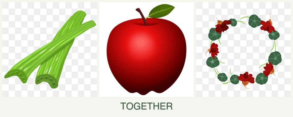 Growth Requirements: Celery prefers cooler weather and consistent moisture, while apples require full sun and well-drained soil. Nasturtiums are hardy and adapt to various conditions, making them a versatile companion.