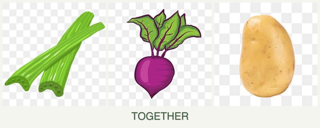All three crops have different nutrient requirements. Celery and beets can be planted closer together, while potatoes need more space for tuber development.