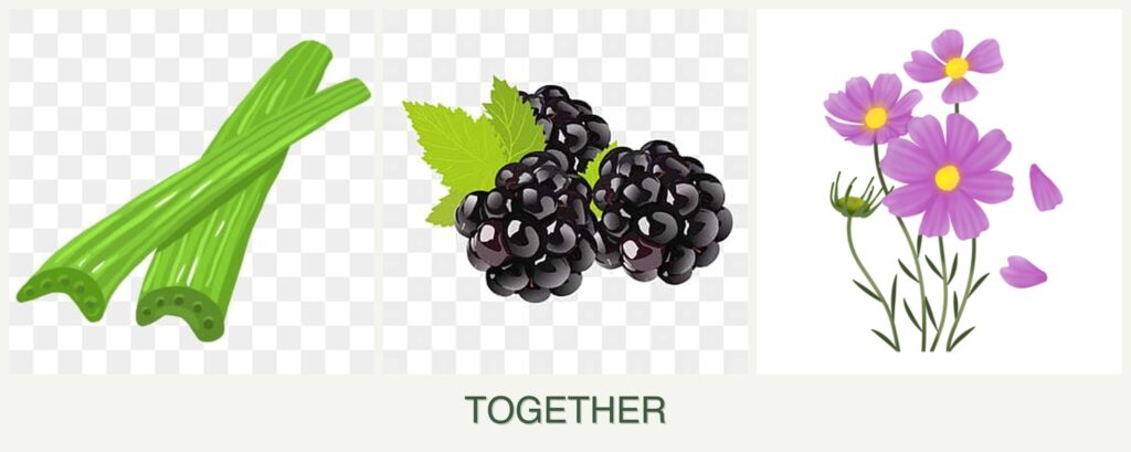 Growth Requirements: Celery thrives in cool, moist conditions with rich soil, while blackberries prefer well-drained soil and full sun. Cosmos, on the other hand, are versatile and can adapt to various conditions, making them a flexible companion.