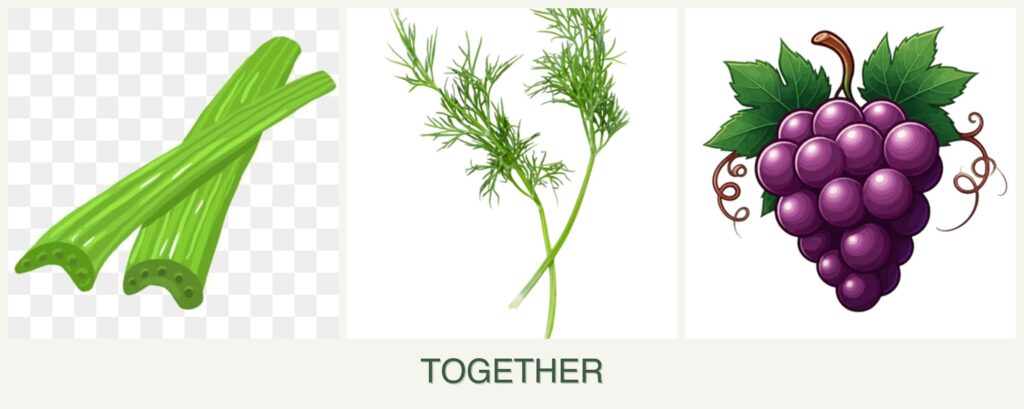 - Growth Requirements: Celery and dill both prefer cooler temperatures and can share similar soil conditions, while grapes thrive in warmer climates.