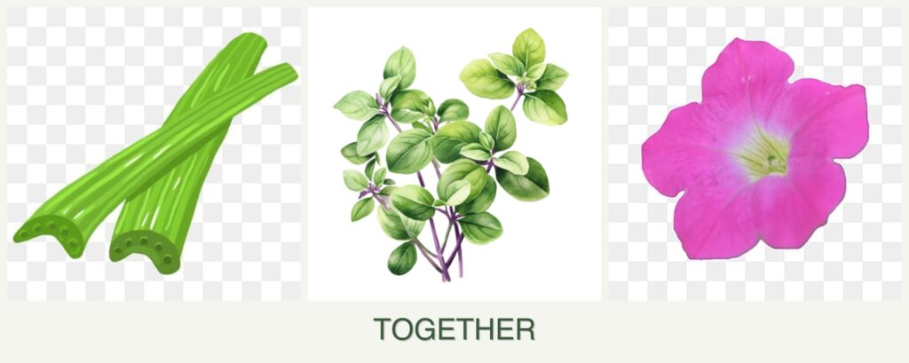 - Resource Competition: Celery’s high water and nutrient needs may compete with oregano and petunias.