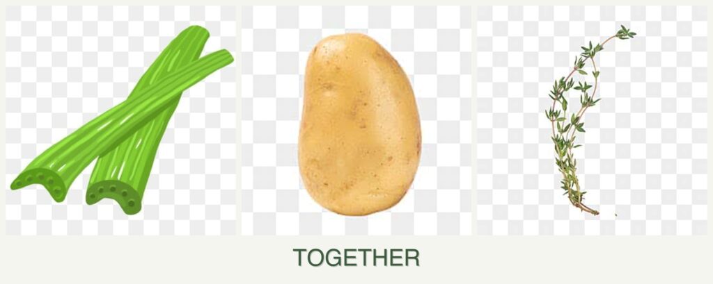 Timing: Plant potatoes early in the season, followed by celery. Thyme can be planted throughout the growing season.