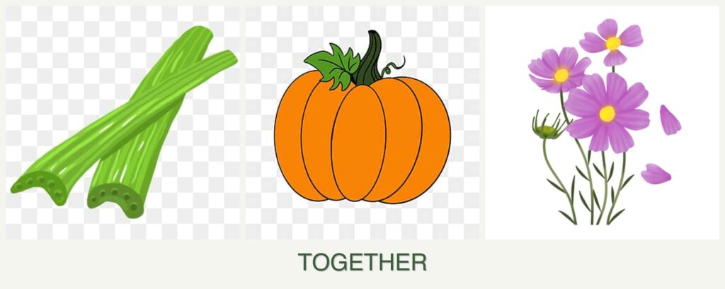 Pest Control: Cosmos attract beneficial insects like bees and butterflies, which can help pollinate pumpkins. Celery can deter certain pests, acting as a natural pest repellent for pumpkins.