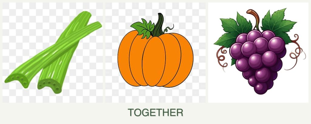 Celery, pumpkin, and grapes have different water and sunlight needs, leading to competition. Pumpkins’ sprawling vines can overshadow celery, depriving it of necessary sunlight.