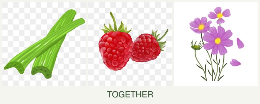 - Pest Repellent Properties: Cosmos attract beneficial insects like bees and butterflies, which can help pollinate raspberries. The scent of celery may deter some pests that target raspberries.