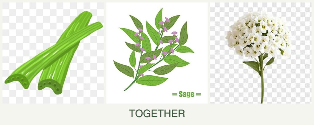 - Pest Control: Sage acts as a natural pest repellent, deterring common garden pests that may affect celery. Alyssum attracts beneficial insects like hoverflies, which help control aphid populations.