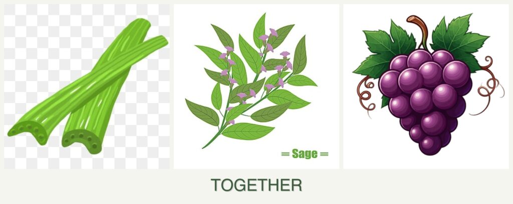 - Competition for Resources: Celery’s high water and nutrient needs can deprive sage and grapes.