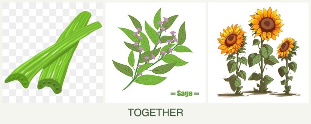 Nutrient Needs and Spacing: Celery is a heavy feeder and may compete with sunflowers for nutrients, while sage’s moderate needs make it a less competitive neighbor. Proper spacing is crucial to avoid overcrowding and resource competition.
