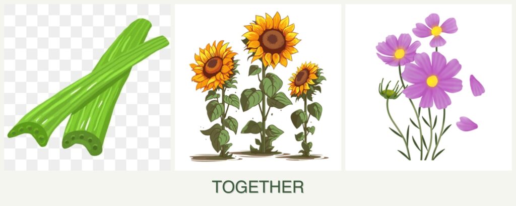 - Nutrient Needs: Sunflowers are heavy feeders, so it’s essential to ensure they don’t overshadow celery’s nutrient requirements. Cosmos are less demanding, making them a good intermediary.