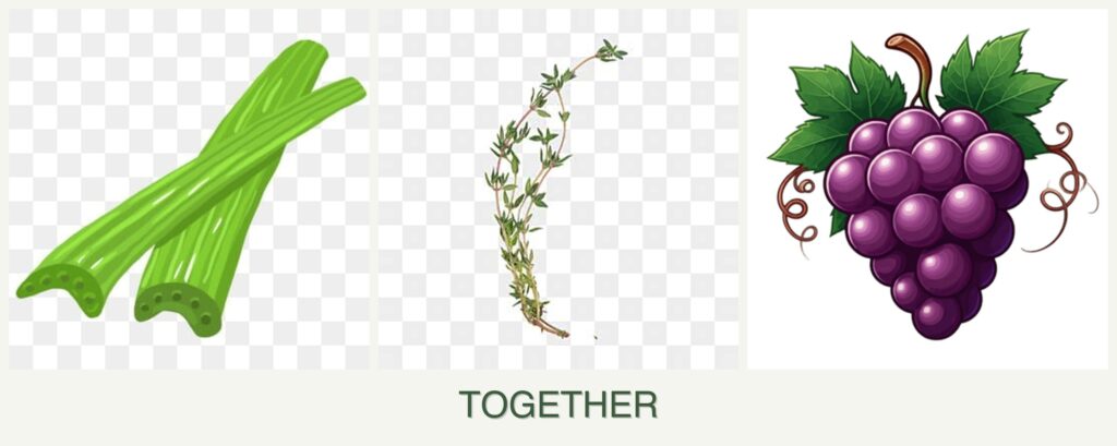 - Nutrient Needs: Celery and thyme have different nutrient requirements, which means they won’t compete heavily for soil nutrients. Grapes require more nutrients, so regular fertilization is crucial.
