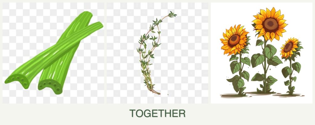 - Nutrient Needs: Celery is a heavy feeder, sunflowers are moderate feeders, and thyme requires fewer nutrients, making them compatible if soil fertility is managed.