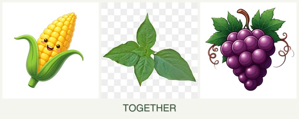 - Spacing: Corn requires significant space, which can overshadow basil and interfere with grape trellises.