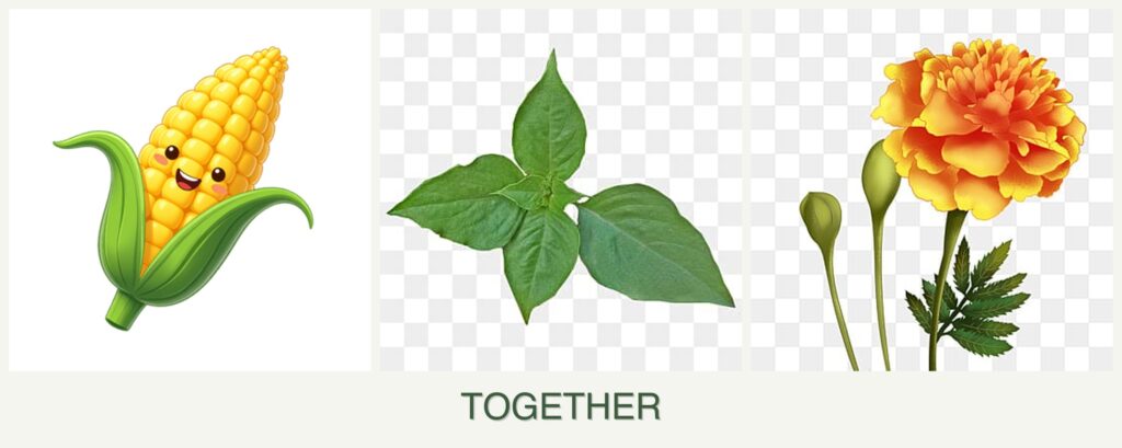 - Resource Competition: Corn’s heavy nutrient needs can overshadow basil and marigolds if not managed.