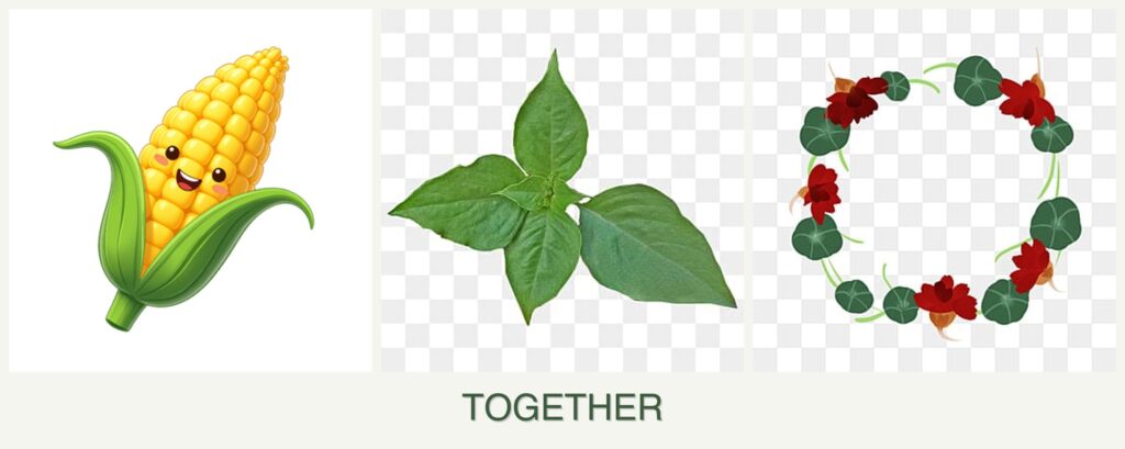 - Timing: Plant corn first in late spring, followed by basil and nasturtiums once the soil warms up.