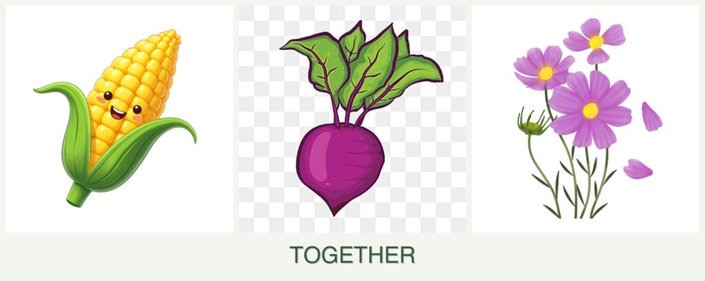 - Optimal Spacing: Plant corn in blocks for wind pollination. Space beets 2-4 inches apart in rows between corn. Place cosmos at the garden’s edge.