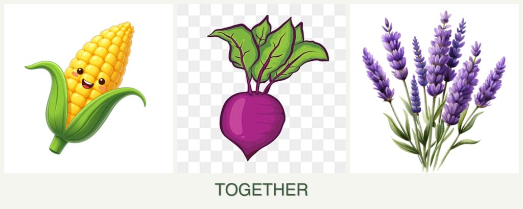 Nutrient Needs and Spacing: Corn is a heavy feeder, requiring nitrogen-rich soil, whereas beets and lavender have lower nutrient demands. Corn also grows tall and can cast shade, which may not be ideal for lavender’s sun-loving nature.