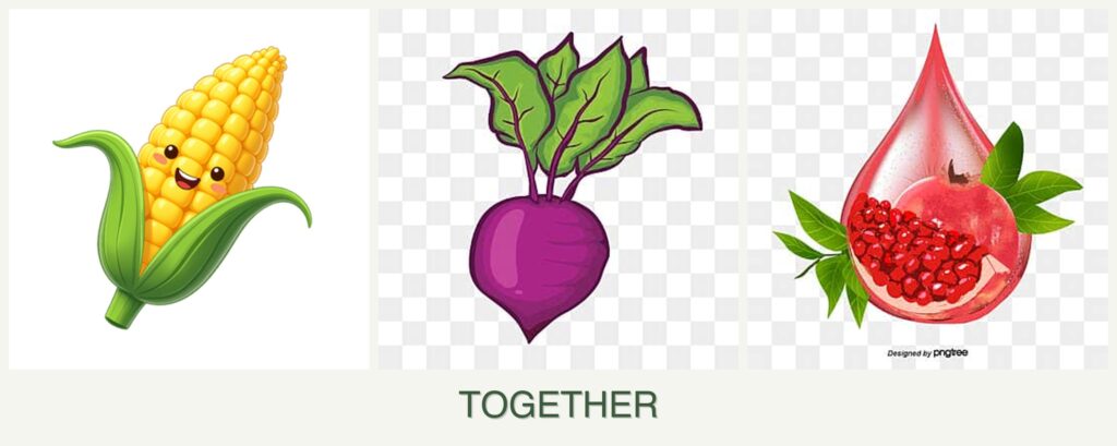 Corn and beets can complement each other, as beets do not compete heavily for nutrients and can benefit from the shade provided by taller corn plants. However, pomegranates’ distinct pest and disease profiles do not align with those of corn and beets, making them less compatible.