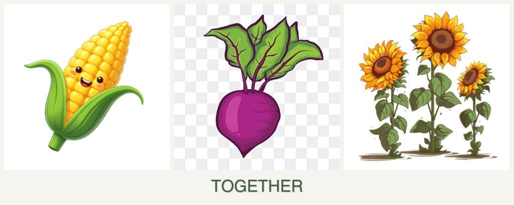 - Growth Requirements: Corn and sunflowers both require full sun and can grow tall, providing a natural windbreak for beets, which are shorter and prefer cooler soil. Beets can benefit from the shade provided by the taller plants.