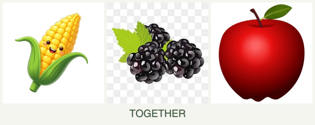 Growth Requirements: Corn thrives in full sun and well-drained soil, while blackberries prefer slightly acidic soil and full sun to partial shade. Apples need full sun and well-drained, slightly acidic soil. Ensuring each plant’s needs are met is crucial for successful companion planting.