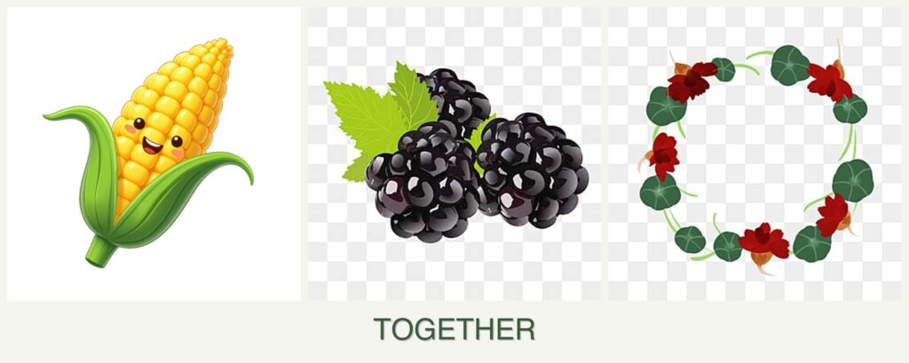 - Growth Requirements: Corn requires full sun and well-drained soil. Blackberries thrive in slightly acidic soil with good drainage, while nasturtiums prefer poorer soils and can tolerate partial shade.