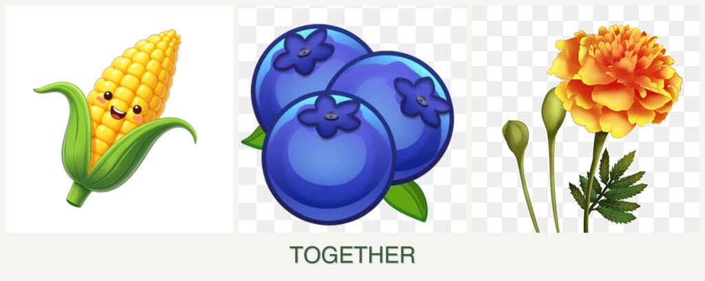 - Soil Preparation Tips: Amend soil with sulfur for blueberries, and ensure well-draining, nutrient-rich soil for corn and marigolds.