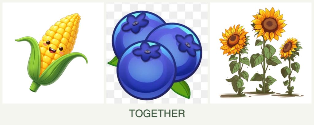 The short answer is no. These plants have differing needs that make them incompatible companions. Corn thrives in full sun and requires nitrogen-rich soil, while blueberries need acidic soil and consistent moisture. Sunflowers can grow in a variety of soils but compete heavily for nutrients. These differences in growth requirements, spacing, and nutrient needs make them unsuitable companions.