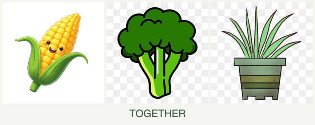 - Spacing: Corn grows tall and can shade out smaller plants like broccoli and lemongrass, which need adequate sunlight.