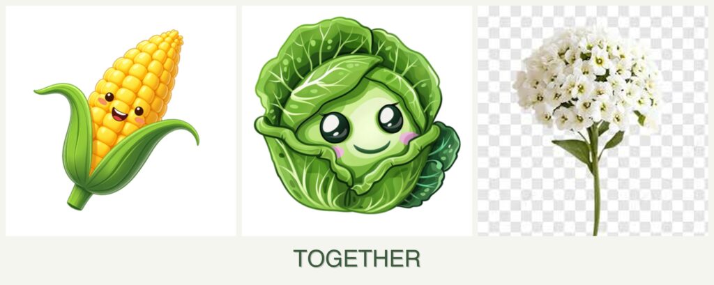 - Timing: Plant corn in spring after frost; cabbage can be planted early spring or fall; alyssum can be sown in spring.