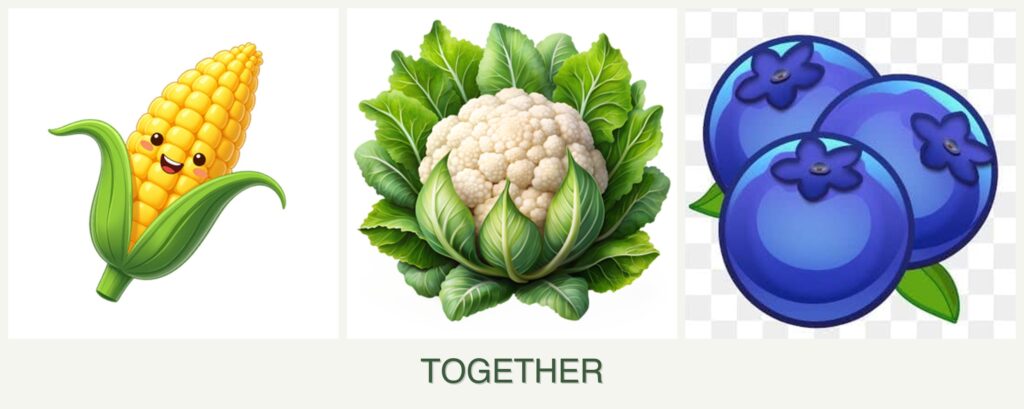 - Growth Requirements: Corn and cauliflower share similar sun and soil needs but differ from blueberries.