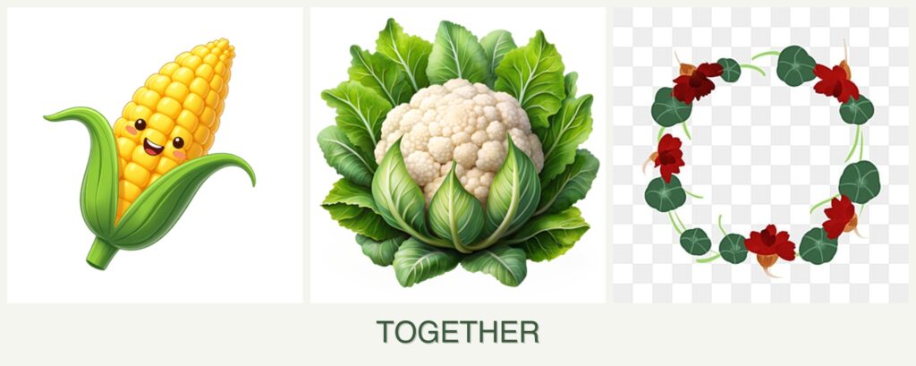 - Timing: Plant corn first, followed by cauliflower and nasturtiums, to accommodate their growth cycles.