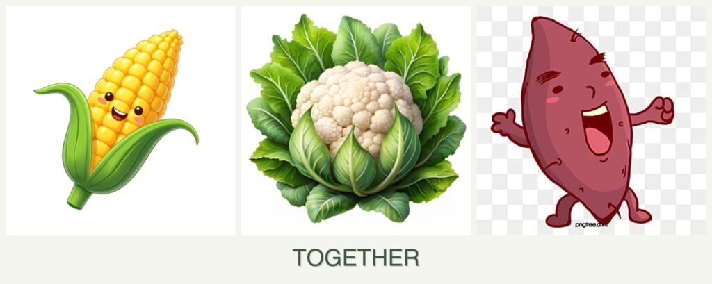 - Growth Requirements: Corn grows tall and requires full sun, while cauliflower needs cooler temperatures and consistent moisture. Sweet potatoes thrive in warm, sunny conditions but need ample space to spread.