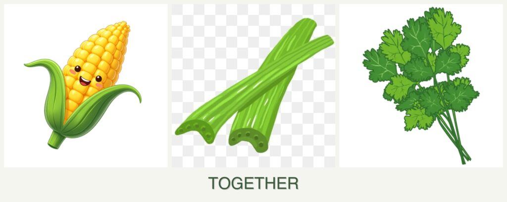 - Optimal Spacing: Plant corn in rows, with celery and cilantro interspersed to maximize space.